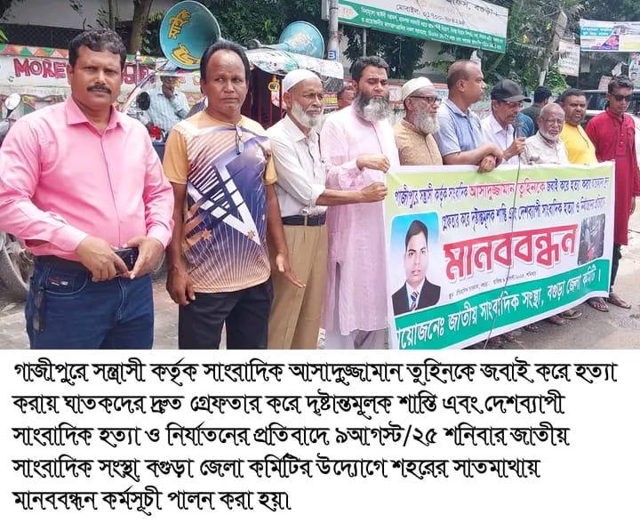 গাজীপুরে সন্ত্রাসী কর্তৃক সাংবাদিক আসাদুজ্জামান তুহিনকে জবাই করে হত্যা করায় ঘাতকদের দ্রুত গ্রেফতার করে দৃষ্টান্তমূলক শাস্তি এবং দেশব্যাপী সাংবাদিক হত্যা ও নির্যাতনের প্রতিবাদে ৯আগস্ট/২৫ শনিবার জাতীয় সাংবাদিক সংস্থা বগুড়া জেলা কমিটির উদ্যোগে শহরের সাতমাথায় মানববন্ধন কর্মসূচী পালন করা হয়েছে।