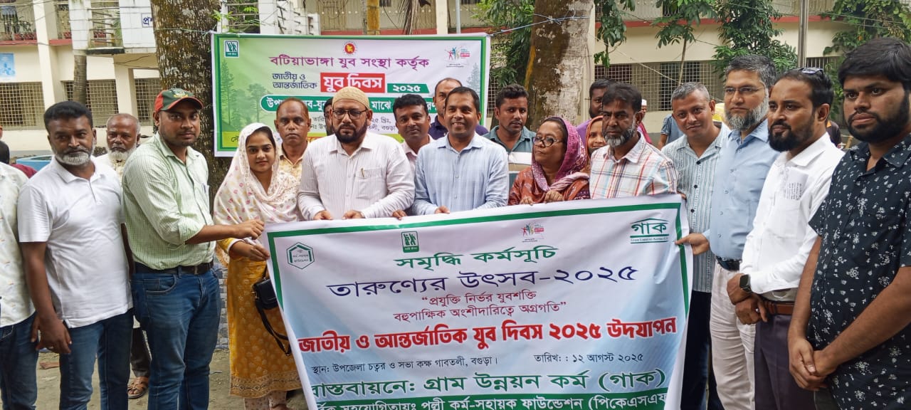 গাবতলী (বগুড়া) প্রতিনিধিঃ ১২ আগষ্ট বগুড়ার গাবতলীতে জাতীয় যুব দিবস -২৫ উপলক্ষে বর্ণাঢ্য রেলী আলোচনা সভা অনুষ্ঠিত হয়েছে। এতে সভাপতির বক্তব্য রাখেন উপজেলা সহকারী কমিশনার (ভূমি) আব্দুল্লাহ ইবনে মাসুদ আহমেদ। এ সময় বক্তব্য রাখেন উপজেলা যুব উন্নয়ন কর্মকর্তা নাজিয়া সামস, উপজেলা বিএনপি'র সাধারণ সম্পাদক এনামুল হক নতুন, যুগ্ম সাধারণ সম্পাদক মিজানুর রহমান মিন্টু, উপজেলা প্রাথমিক শিক্ষা কর্মকর্তা কামরুল হাসান মনি, উপজেলা সমাজসেবা কর্মকর্তা নাঈম হোসেন, উপজেলা পল্লী উন্নয়ন কর্মকর্তা রেজাউল করিম, রুপালী ব্যাংকের ব্যবস্থাপক মিরাজুল ইসলাম, সহকারী যুব উন্নয়ন কর্মকর্তা আশরাফুল ইসলাম, আরিফুর ইসলাম, সিদ্দিকুজ্জামান, নুরে আজম, কোষাধক্ষ্য গোলাম রব্বানী, সিরিন আকতার প্রমূখ। যুব দিবসে বৃক্ষ বিতরণ, যুব ঋণের চেক বিতরণ করা হয়।