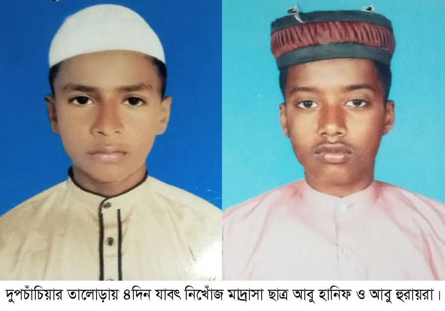 দুপচাঁচিয়া উপজেলার তালোড়ায় ৪দিন যাবৎ মাদ্রাসার ২ ছাত্র নিখোঁজ হয়েছে। নিখোঁজের পর হতে অভিভাবকরা বিভিন্নস্থানে খোঁজাখুঁজি করে না পেয়ে গত ১১আগস্ট সোমবার দুপচাঁচিয়া থানায় পৃথক পৃথকভাবে সাধারণ ডায়েরী(জিডি) করেছেন। নিখোঁজ ছাত্ররা হলো আবু হুরায়রা(১৪) ও আবু হানিফ(১৫)। আবু হুরায়রা কাহালু উপজেলার জামগ্রাম ইউনিয়নের পরিশেষ গ্রামের আশেক বাবুর ছেলে ও আবু হানিফ একই উপজেলার বীরকেদার ইউনিয়নের গুলিয়ারপাড়া গ্রামের আনিছুর রহমানের ছেলে। তারা দু’জনেই তালোড়া জামিয়া ইসলামিয়া দারুল উলূম(লুৎফর রহমান) ক্বওমী মাদরাসার ছাত্র। নিখোঁজের ঘটনায় আবু হুরায়রার ফুফু ফজিলা বিবি দুপচাঁচিয়া থানার জিডিতে উল্লেখ করেছেন গত ৮আগস্ট তার ভাতিজা আবু হুরায়রা বিকেল ৫.৩৫মিনিটে উক্ত মাদ্রাসা হতে পায়ে হেটে তালোড়া বাজারে যাবার পর থেকে আর মাদ্রাসায় ফিরেনি। সেই থেকে আজ পর্যন্ত বিভিন্নস্থানে তাকে খোঁজাখুঁজি করে তার কোনো সন্ধান মেলেনি। অপরদিকে একইদিন অত্র মাদ্রাসা হতে একই সময়ে আবু হানিক মাদ্রাসা থেকে বের হয়ে আর ফিরে আসেনি বলে তার বাবা আনিছুর রহমান থানায় জিডি করেছেন। এই দুই ছাত্র নিখোঁজের ঘটনায় উভয় পরিবারের মাঝে উৎকণ্ঠা বিরাজ করছে। তারা দ্রুত তাদের সন্তানদের উদ্ধারে থানা প্রশাসনের হস্তক্ষেপ কামনা করেছেন।