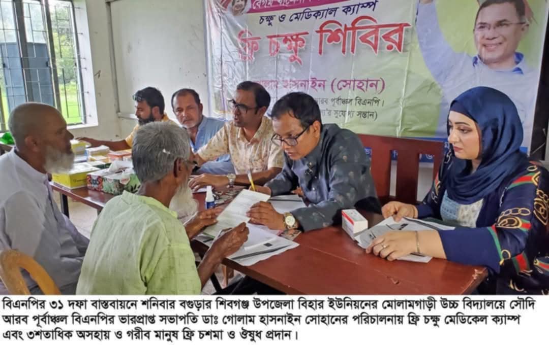 শনিবার ৩০আগস্ট বগুড়ার শিবগঞ্জ উপজেলা বিহার ইউনিয়নের মোলামগাড়ী উচ্চ বিদ্যালয়ে এই ফ্রি চক্ষু মেডিকেল ক্যাম্পের আয়োজন করেন সৌদি আরব পূর্বাঞ্চল বিএনপির ভারপ্রাপ্ত সভাপতি ডাঃ গোলাম হাসনাইন সোহান।
