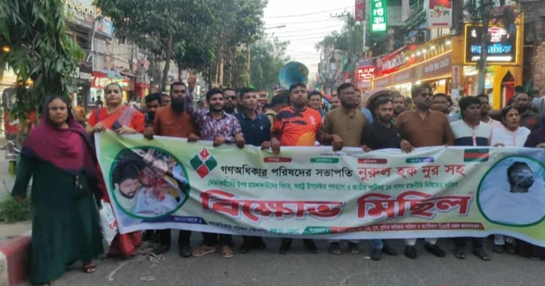 গণঅধিকার পরিষদের সভাপতি ডাকসুর সাবেক ভিপি নুরুল হক নুরসহ নেতাকর্মীদের উপর হামলাকারীদের বিচার, স্বরাষ্ট্র উপদেষ্টার পদত্যাগ ও জাতীয় পার্টিসহ ১৪ দলের রাজনীতি নিষিদ্ধের দাবিতে বিক্ষোভ মিছিল বৃহস্পতিবার (৪ সেপ্টেম্বর) বগুড়ার সাতমাথায় অনুষ্ঠিত হয়।