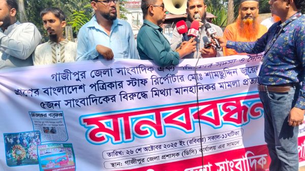 গাজীপুরের সাংবাদিকের বিরুদ্ধে মানহানি “মিথ্যা” মামলার প্রতিবাদে মানববন্ধন!