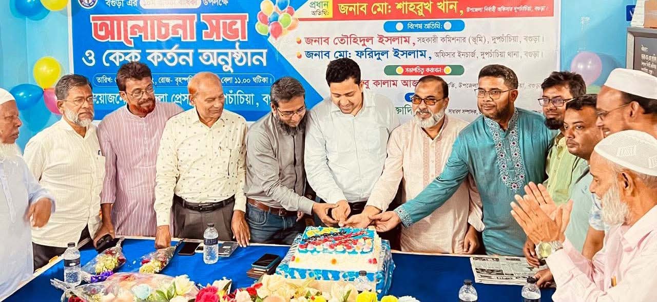 দুপচাঁচিয়ায় উপজেলা প্রেসক্লাবের ১০ম প্রতিষ্ঠা বার্ষিকী উপলক্ষে আলোচনা সভা ও কেক কর্তন অনুষ্ঠিত হয়েছে। ৬নভেম্বর বৃহস্পতিবার ক্লাব কার্যালয়ে উপজেলা প্রেসক্লাবের সভাপতি আবু কালাম আজাদের সভাপতিত্বে ও সাধারণ সম্পাদক গোলাম মুক্তাদির সবুজ এবং সদস্য আজিজুল হকের পরিচালনায় আলোচনা সভায় প্রধান অতিথির বক্তব্য রাখেন উপজেলা নির্বাহী অফিসার শাহরুখ খান। বিশেষ অতিথির বক্তব্য রাখেন থানার পুলিশ পরিদর্শক(তদন্ত) নাছিরুল ইসলাম। আমন্ত্রিত অতিথির বক্তব্য রাখেন সরকারি পাইলট মডেল উচ্চ বিদ্যালয়ের ভারপ্রাপ্ত প্রধান শিক্ষক আনিছুল ইসলাম লিটন, দুপচাঁচিয়া প্রেসক্লাবের সভাপতি গোলাম ফারুক, নিউ মার্কেটের স্বত্বাধিকারী আলহাজ্ব শামসুদ্দিন আহমেদ, দুপচাঁচিয়া প্রেসক্লাবের সাধারণ সম্পাদক কেএম বেলাল, সাংবাদিক আখতারুজ্জামান তুহিন, ক্লাবের সহসভাপতি এম,ডি শিমুল, যুগ্ম সাধারণ সম্পাদক আবু রায়হান, সদস্য আবু আব্দুল্লাহ প্রিন্স প্রমুখ।