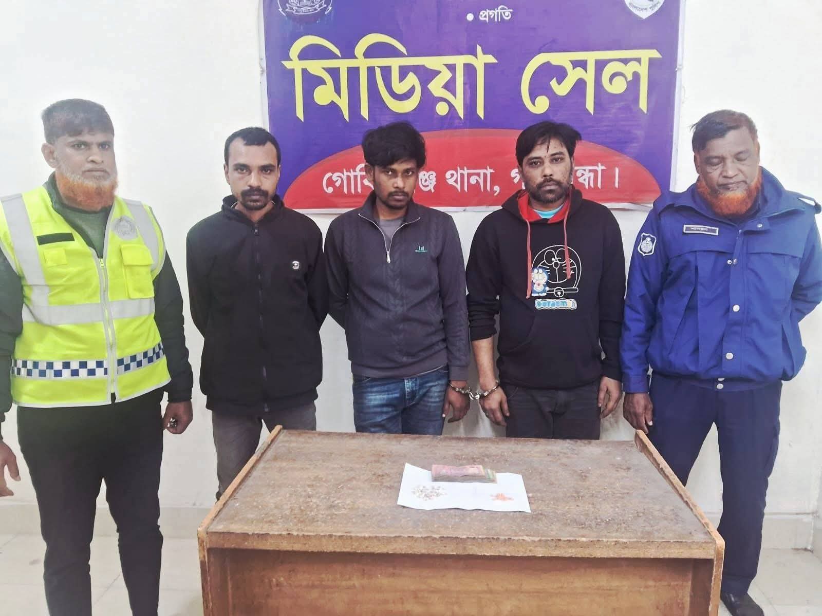এ সময় সেখান থেকে তিনজনকে গ্রেফতার করা হয় এবং তাদের কাছ থেকে ৪৭ পুরিয়া হেরোইন, ২৭ পিস ইয়াবা ট্যাবলেট, একটি ধারালো চাপাতি এবং মাদক বিক্রির নগদ ৩,৭০০ (তিন হাজার সাতশত) টাকা জব্দ করা হয়।