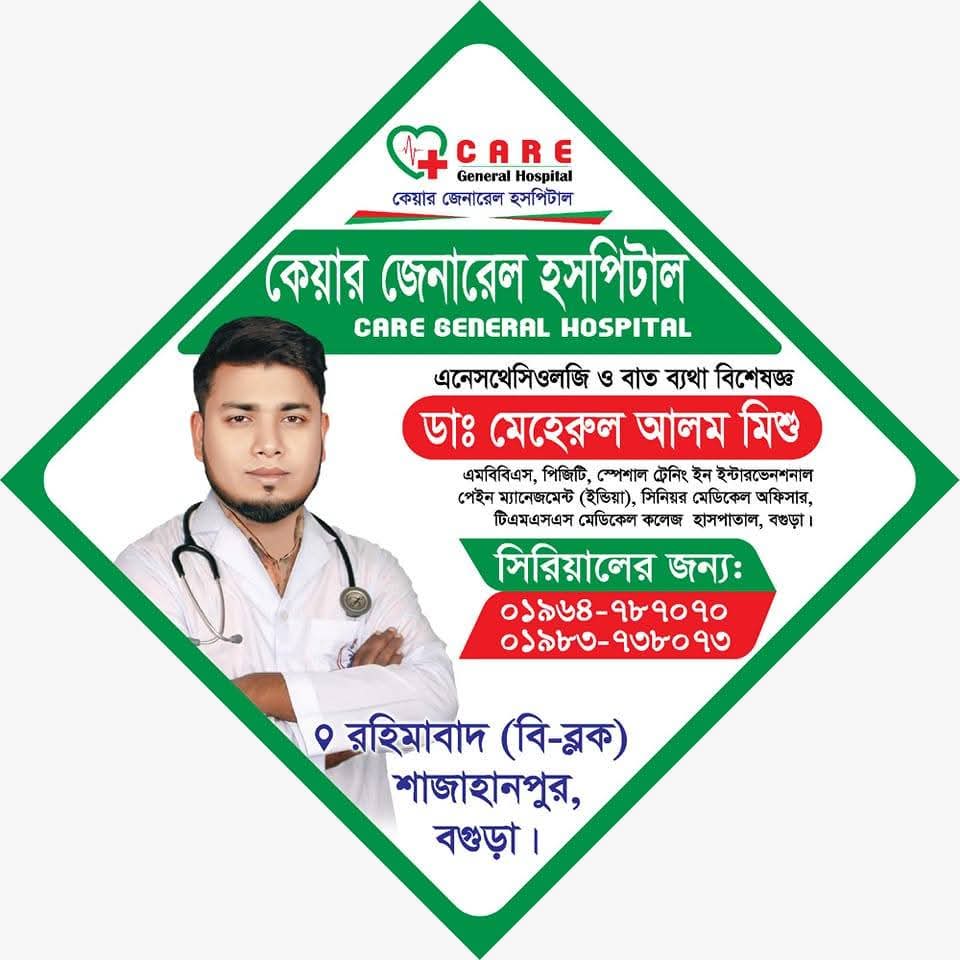 বগুড়ার শাজাহানপুরে কেয়ার জেনারেল হসপিটালের পক্ষ থেকে দেশবাসীসহ, শাজাহানপুর উপজেলা বাসিকে ঈদের অগ্রিম শুভেচ্ছা জানিয়েছেন, কেয়ার জেনারেল হসপিটালের ব্যবস্থাপনা পরিচালক ডাঃ মোঃ মেহেরুল আলম মিশু । তিনি ঈদ শুভেচ্ছা বার্তায় বলেন, দীর্ঘ এক মাস,সিয়াম সাধনার পরে আসে খুশির ঈদ।