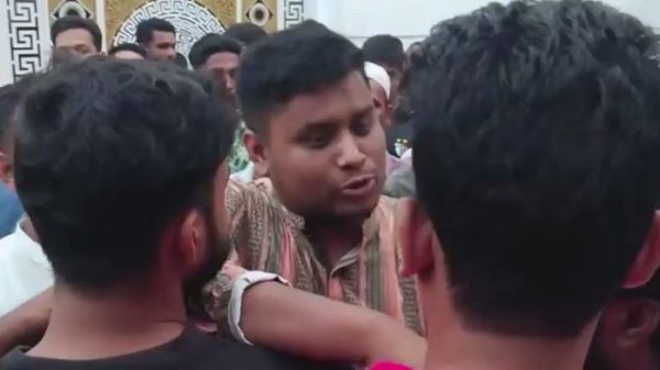 সাবেক সিটি মেয়র ও আওয়ামী লীগ নেতা মনজুর আলমের বাসায় গিয়ে ছাত্রদল নেতাকর্মীদের তোপের মুখে পড়েন হাসনাত আবদুল্লাহ। ছবি: ভিডিও থেকে নেওয়া