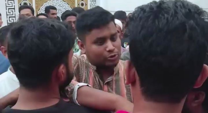 সাবেক সিটি মেয়র ও আওয়ামী লীগ নেতা মনজুর আলমের বাসায় গিয়ে ছাত্রদল নেতাকর্মীদের তোপের মুখে পড়েন হাসনাত আবদুল্লাহ। ছবি: ভিডিও থেকে নেওয়া